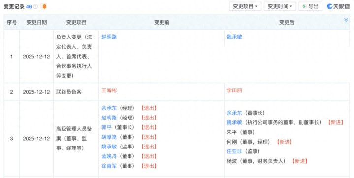 天眼查工商信息显示,12月12日,华为终端有限公司发生工商变更,郭平卸任董事长,由余承东接任,孟晚舟、徐直军等人卸任董事。同时,多位高管发生变更,法定代表人则由赵明路变更为魏承敏。